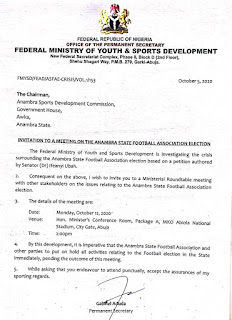 In a letter sent to the chairman Anambra state sports development commission and signed by the permanent secretary in the ministry, Gabriel Aduda, the ministry said it is imperative that the Anambra state football association and other parties put an hold to all activities relating to the football election in the state immediately, pending the outcome of this meeting.