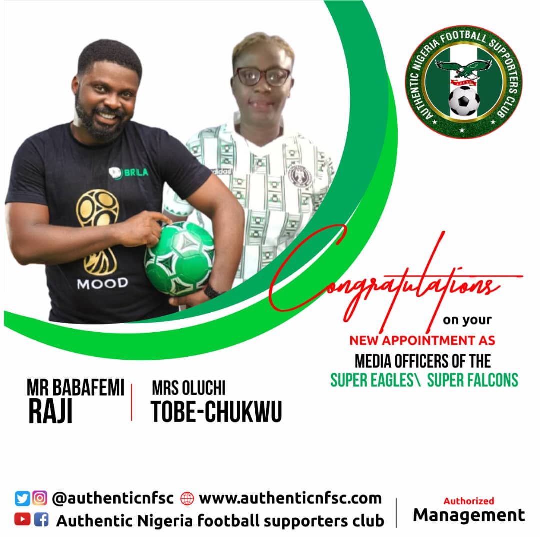 Authentic Nigeria Football Supporters Club felicitate and congratulate Mr Babafemi Raji and Mrs Oluchi Tobe-Chukwu on their appointment as the media officers of the Super Eagles and the Super Falcons respectively.