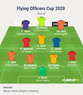 Four Bayelsa Queens players, one each from Confluence Queens, Royal Queens and Nasarawa Amazons, while two each representing Naija Ratels and Edo Queens made the official Flying Officers Cup 2020 team of the tournament. .