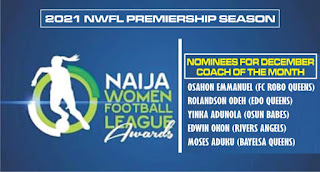 Others are Moses Aduku, who propelled his team to winning three games out of three in the month of December. Edwin Okon for drawing two difficult away games and winning hugely against Delta Queens, Osahon Emmanuel for guiding his side to a 1-0 victory against Nasarawa Amazons in Lafia and a big win against Osun Babes in Lagos.