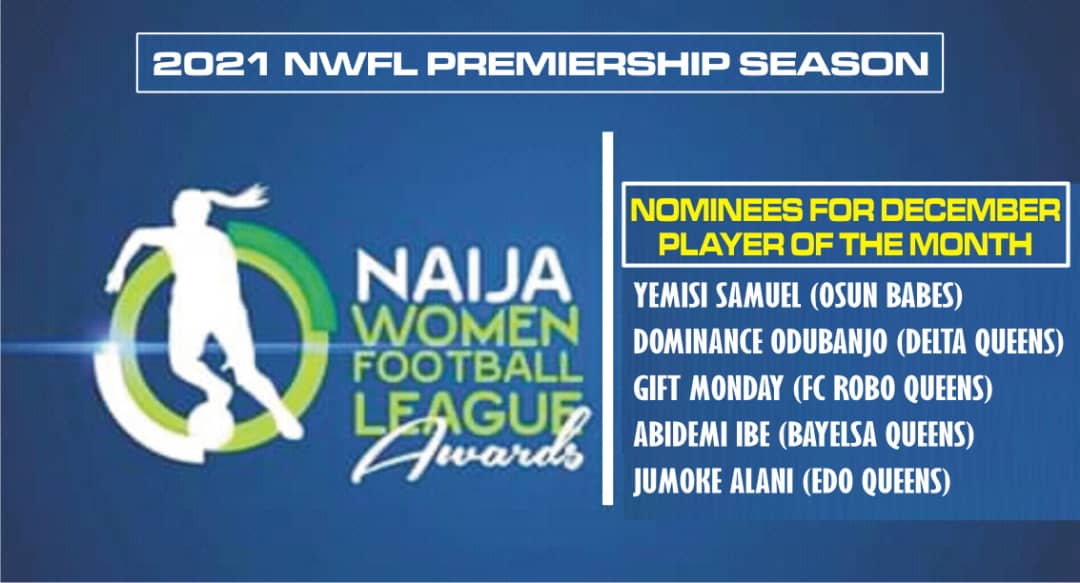 FC Robo Queens star Monday Gift and Osun Babes forward Yemisi Samuel lead the nominees for the December NWFL Premiership player of the month award announced on tuesday, the 29th of December 2020.