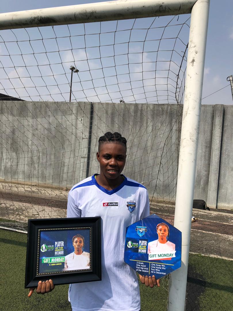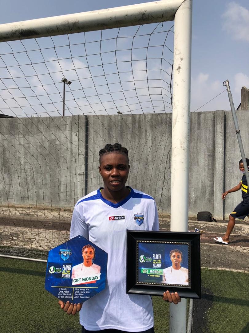 FC Robo Queens forward Gift Monday has received her NWFL Premiership December Player of the month award at the Legacy Football Pitch on Wednesday afternoon.