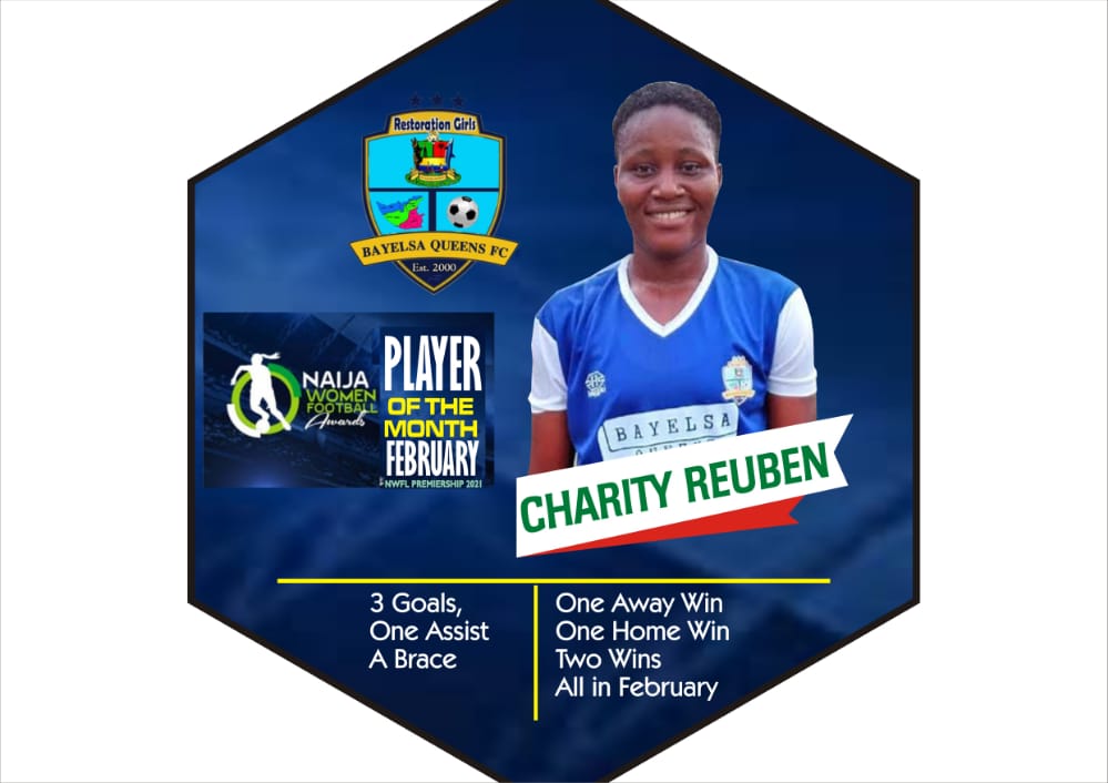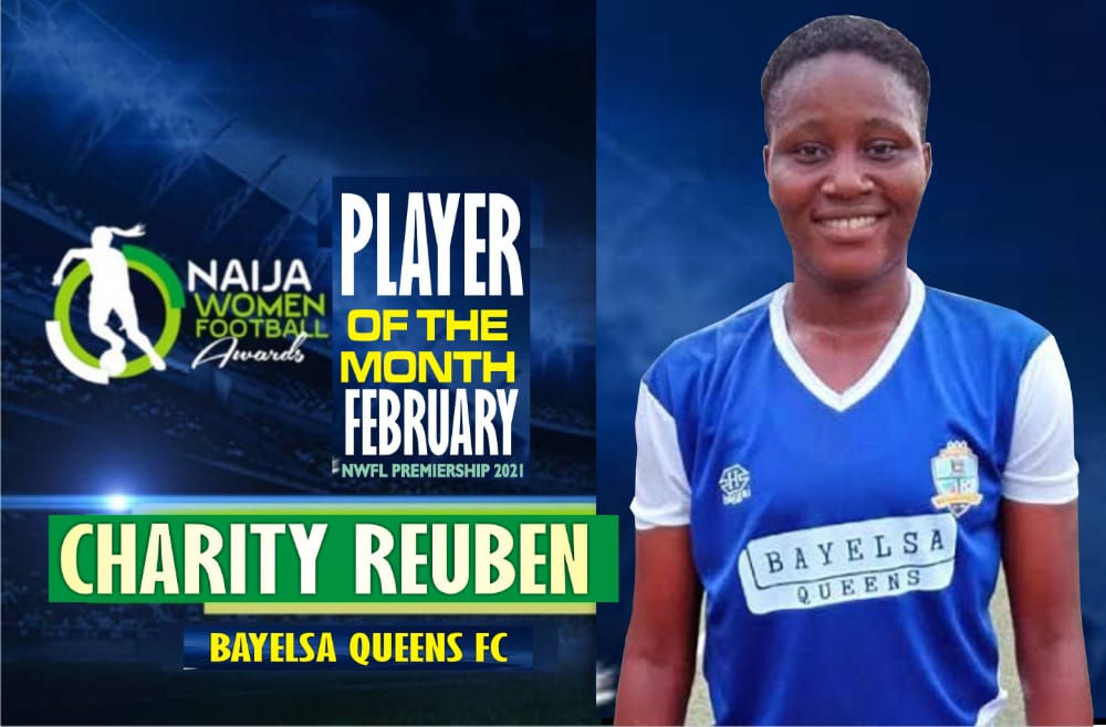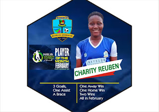 Bayelsa Queens forward Reuben Charity and Rivers Angels Manager Edwin Okon have been named NWFL Premiership Player and Manager For February respectively by the Naija Women Football League Awards.