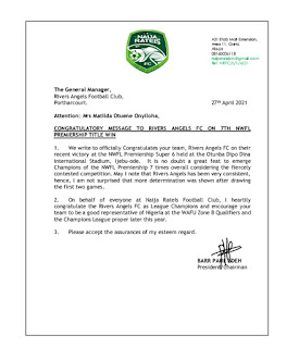 Nigeria Women Football League (NWFL) Championship side, Naija Ratels FC has sent a congratulatory message to the 2021 NWFL Premiership Champions Rivers Angels on their recent success at the just concluded NWFL Premiership Super 6 held at the Otunba Dipo Dina international Stadium, Ijebu-ode.