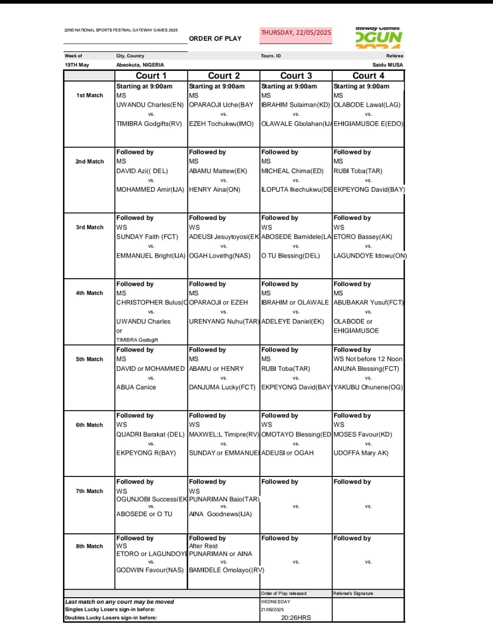 The action kicks off in the morning at the tennis courts of the MKO Abiola Sports Arena, where states will go head-to-head in preliminary rounds, all aiming for a spot in the knockout stage.In some of the key early matchups, Uche Oparaoji of Bayelsa will face Imo’s Ezeh Tochukwu, while Taraba’s Rubi Toba squares off against Ekpeyong David of Bayelsa.